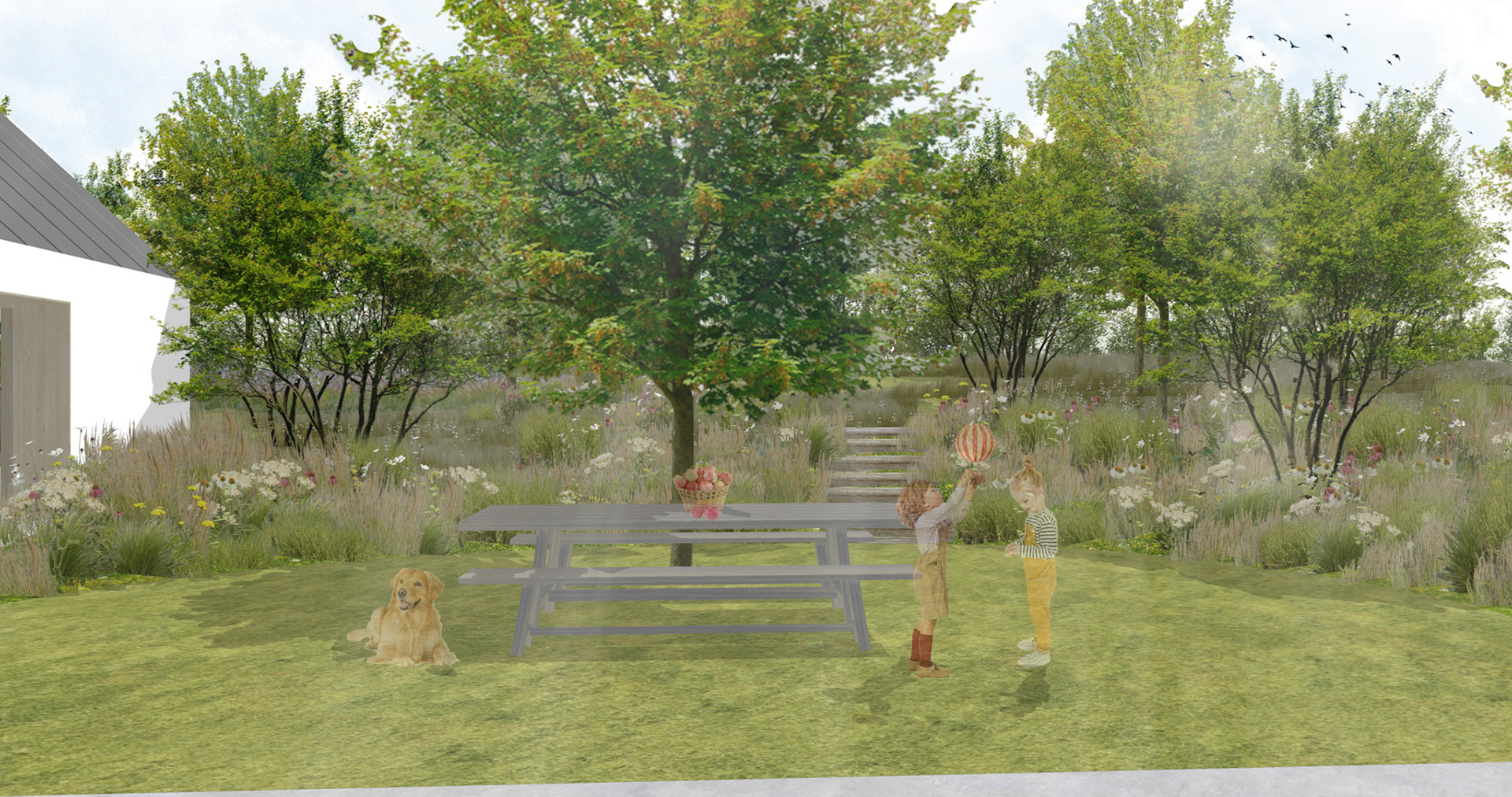 Celá záhrada je postavená na lúčnom trávniku poprepájanom kosenými cestičkami. Prevýšenie záhrady je cca 4m a preto bolo potrebné myslieť na prístup k jednotlivým stupňom záhrady.