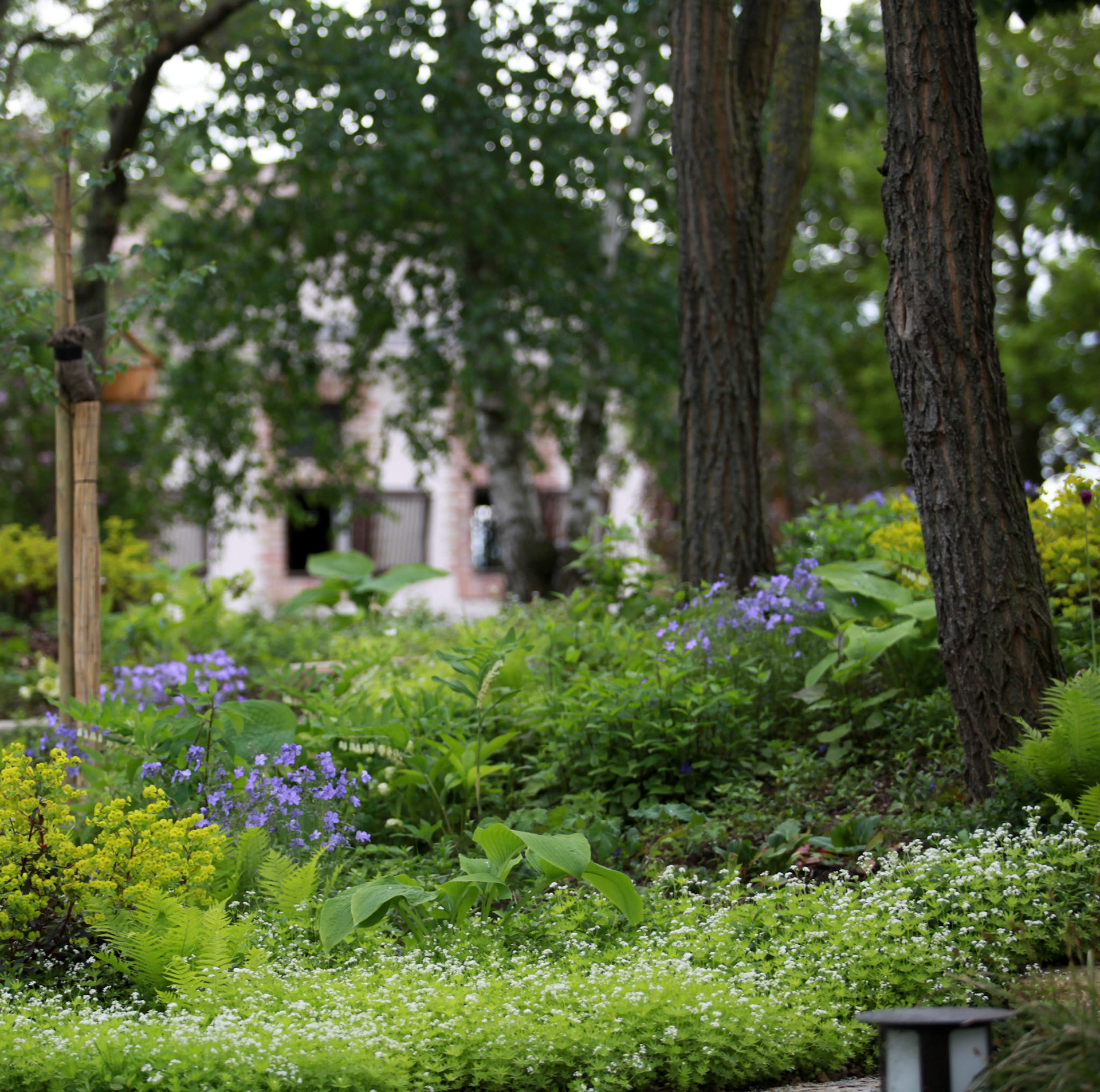 Tienomilné lesné výsadby. Na jar nastupujú čemerice, neskôr je to viac o textúrach - lesné druhy papradí, phloxy, euphorbie, galium, vinca minor, hosty.